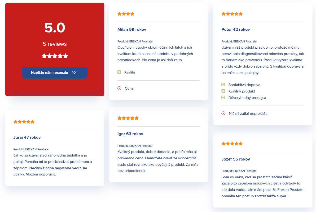 V podobnom znení sa nesú aj skúsenosti ostatných. Erexan Prostate chvália najmä za vysokú koncentráciu účinných látok bez negatívnych vedľajších účinkov. Pripájam pár komentárov z Heureky aj z oficiálneho webu značky Erexan.